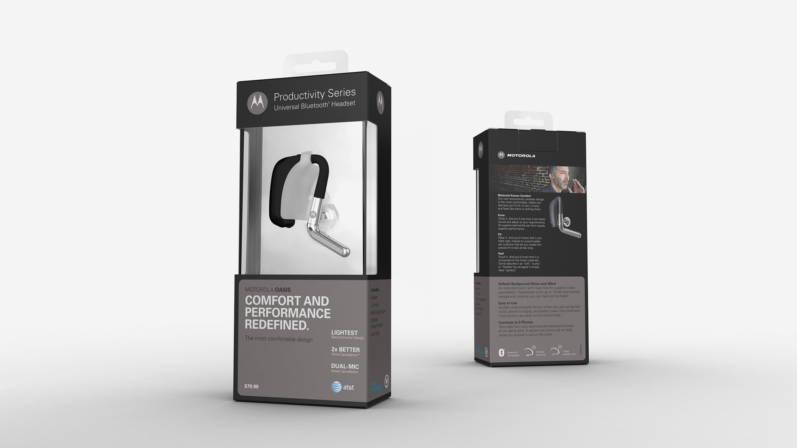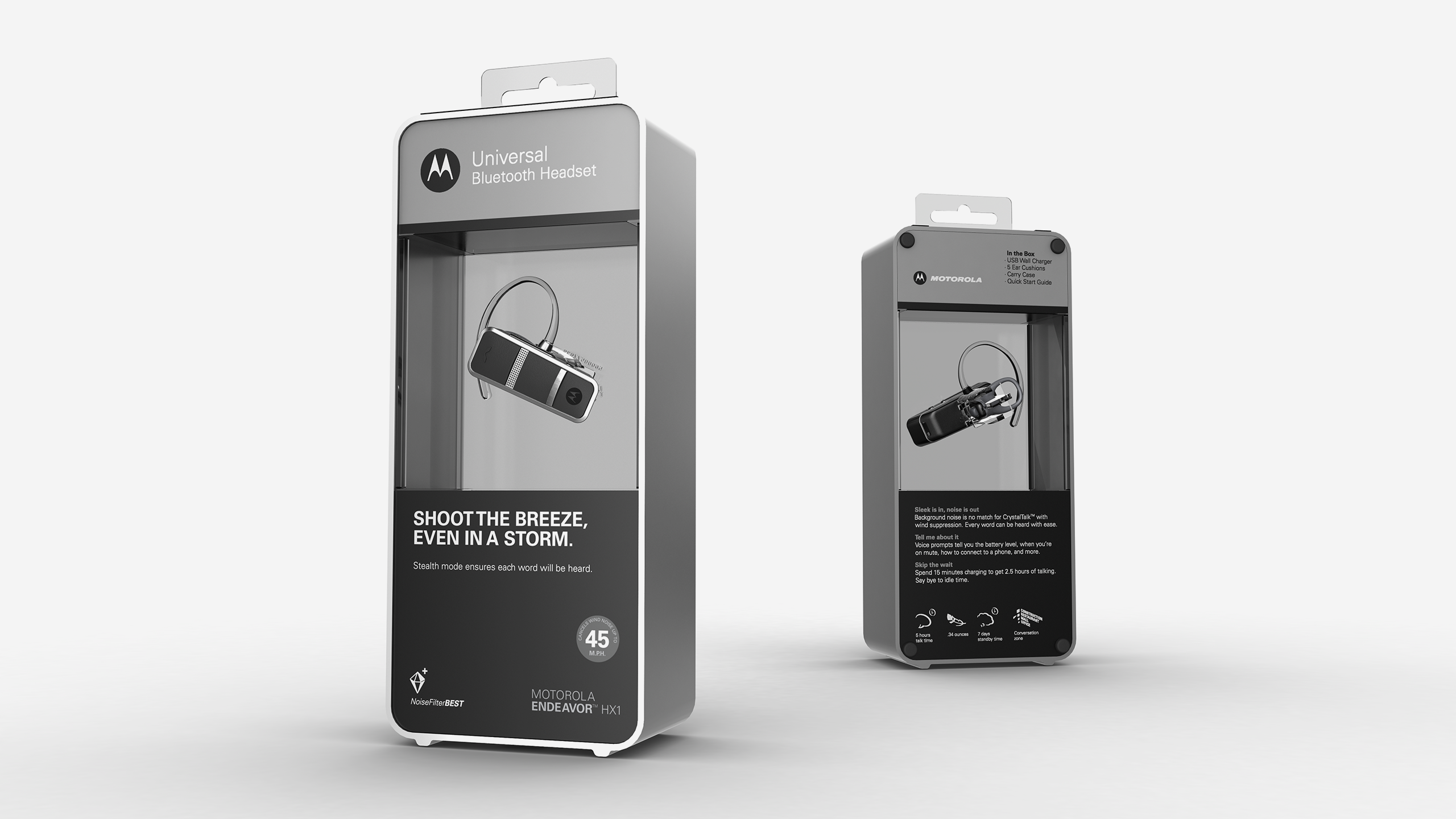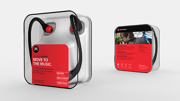 The headset packaging was during the peak bluetooth headset era. Motorola had a lot of headset SKUs at various price points. I created a modular system that could fit all the headsets and show off the different CMFs without utilizing photography or renderings on the packages.