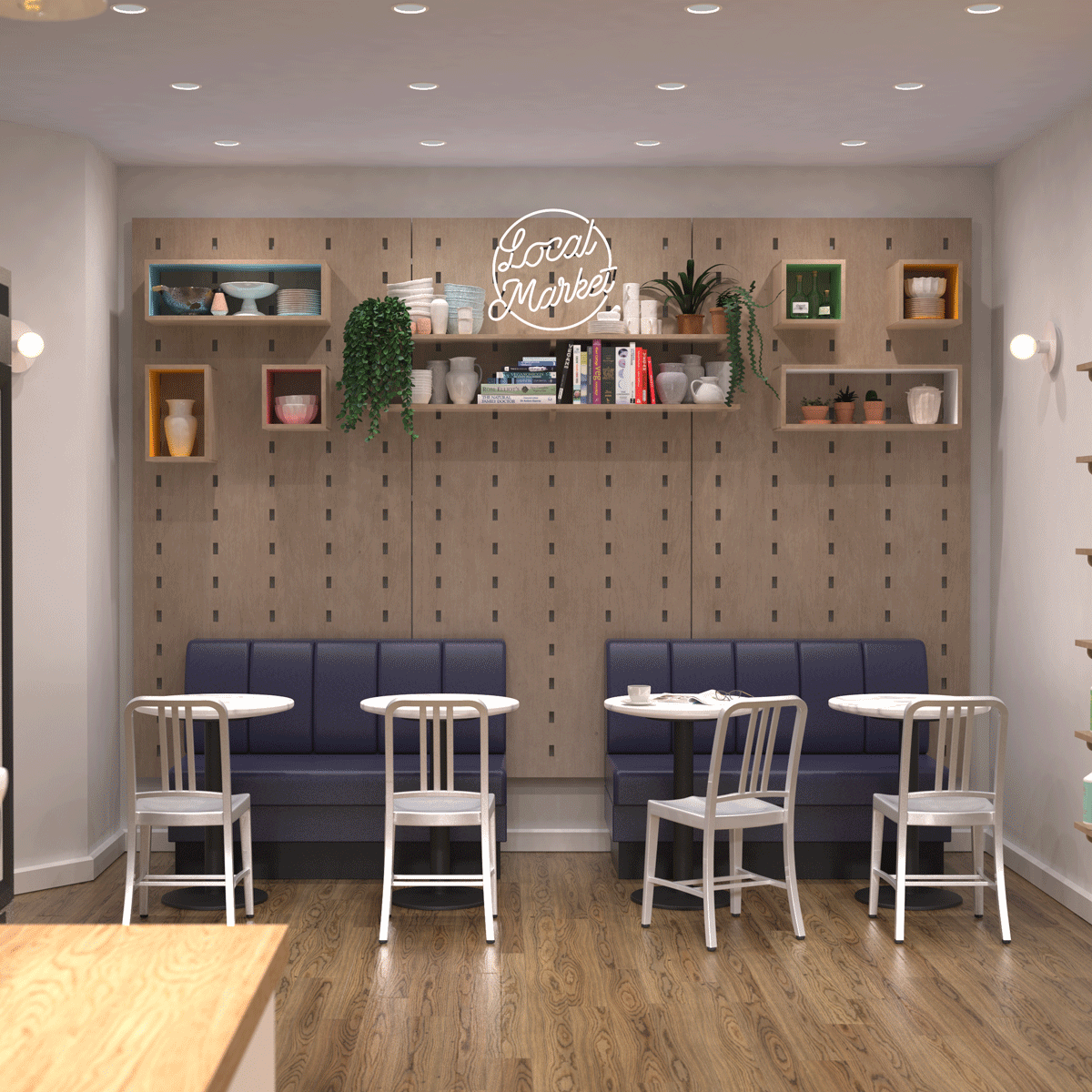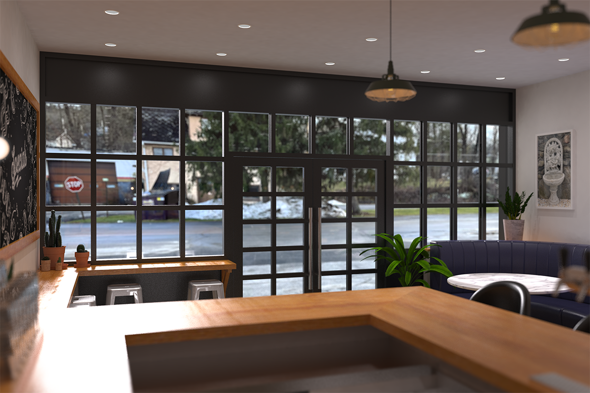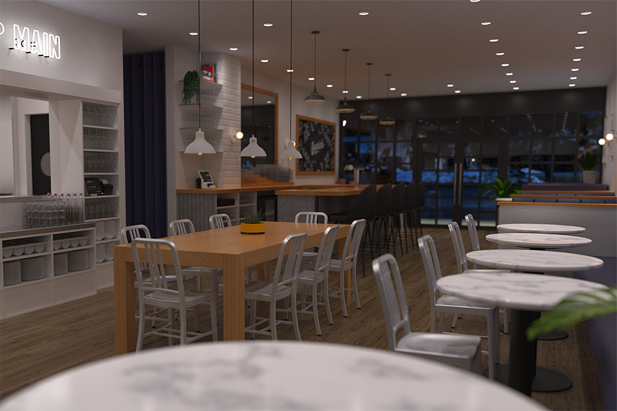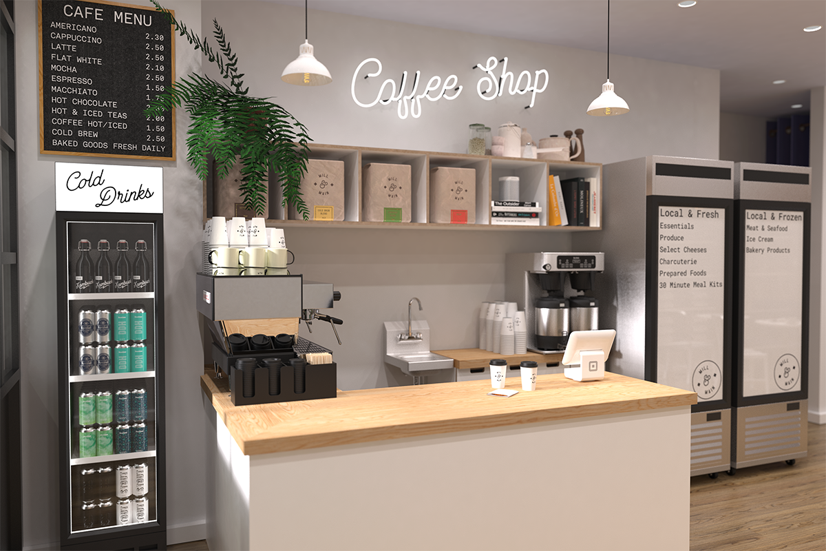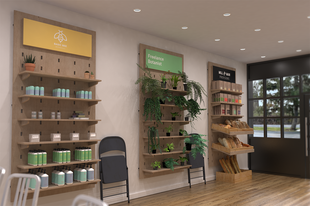 It included a coffee shop with flexible seating, potential retail booths for local vendors & a private label bulk refillery goods section.